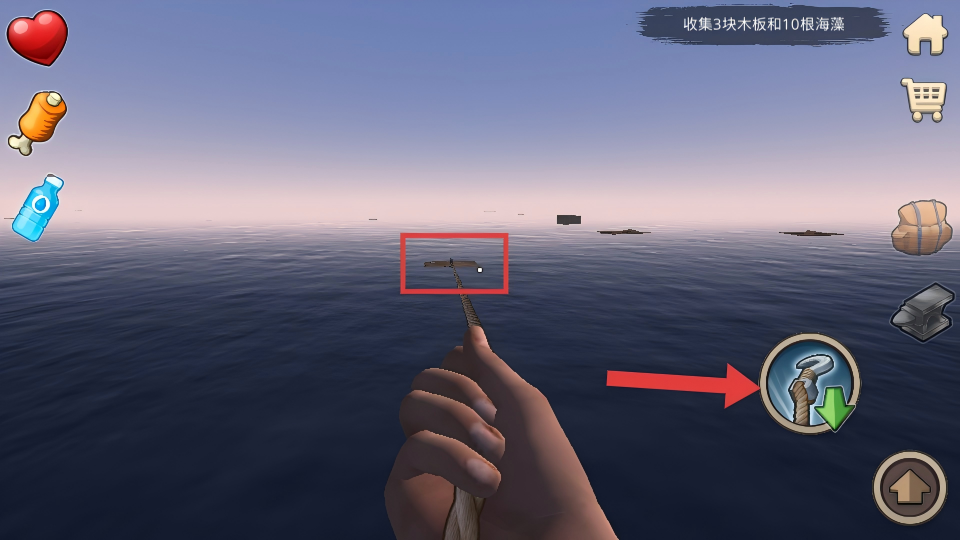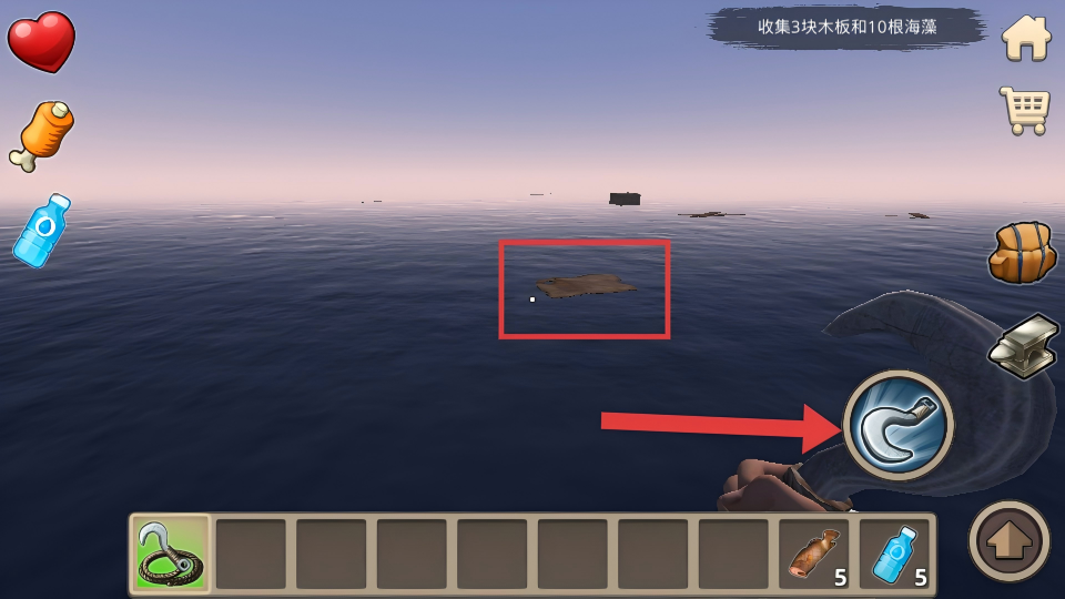 2、进入游戏,依据【收集3块木板和10根海藻】提示,点击红箭头所指【钩子图标】,勾取红框内海面【漂浮木板】。