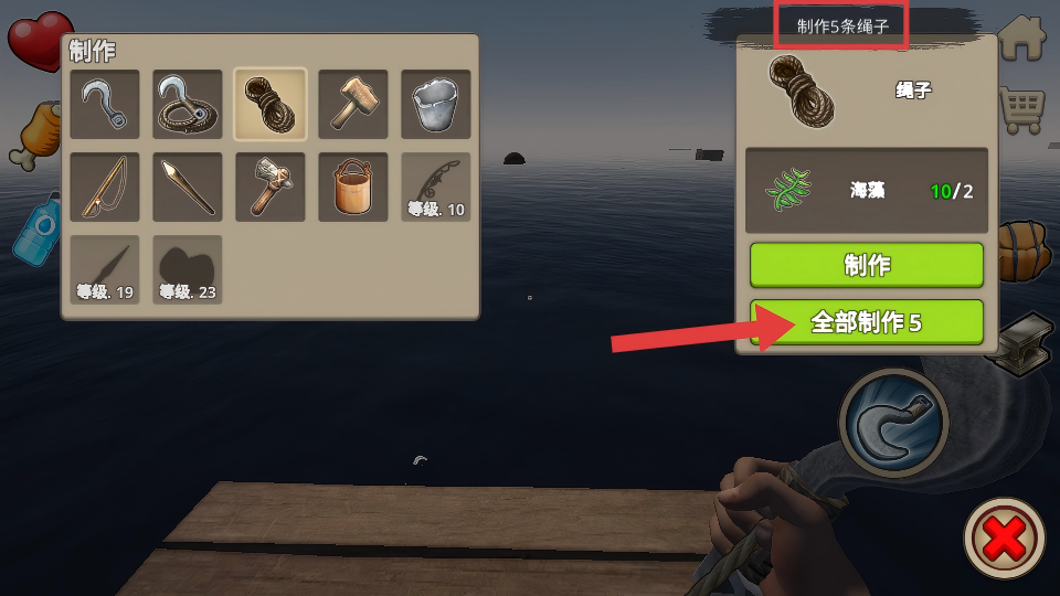 4、完成收集任务后,出现【制作5条绳子】新任务时,点击【全部制作5】按钮,快速完成任务制作需求。