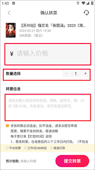 4、在确认转票界面依次填写价格、数量、信息及上传票据图,点击 “提交转票”。