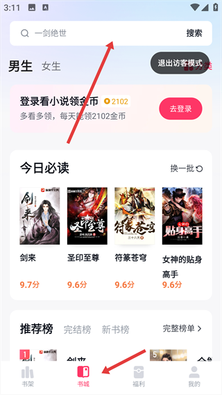 1、在APP的“书城”页面,点击顶部的搜索栏。