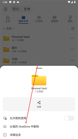 3、在操作菜单中找到从我的OneDrive中删除选项,点击该选项弹出确认窗口。