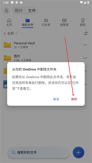 4、在确认窗口中点击删除按钮,完成该文件夹从微软网盘中的删除操作。