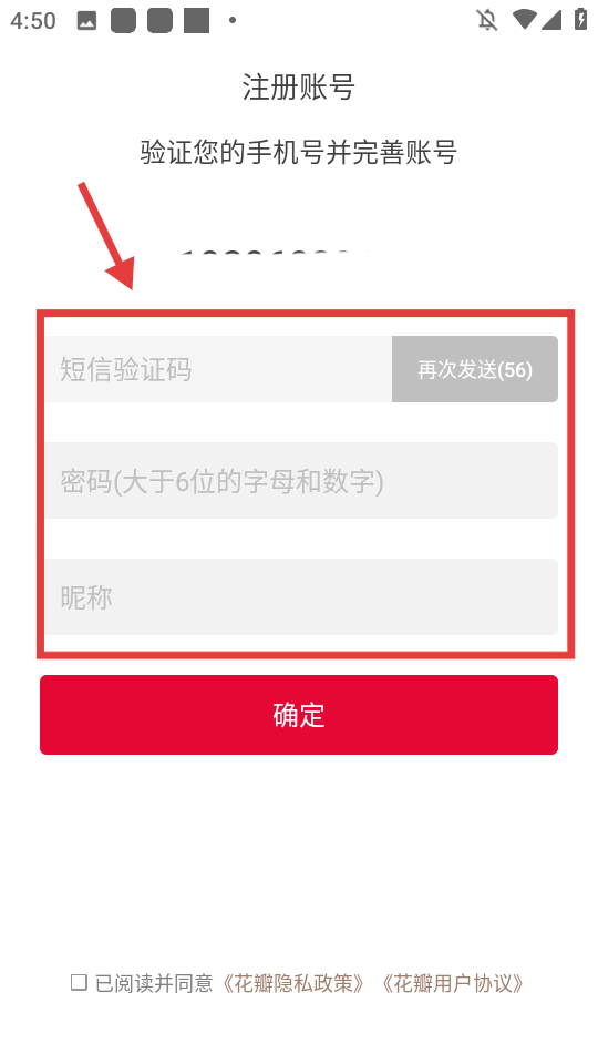 4、输入短信验证码、设置密码(大于6位的字母和数字)和昵称,完成账号注册操作。