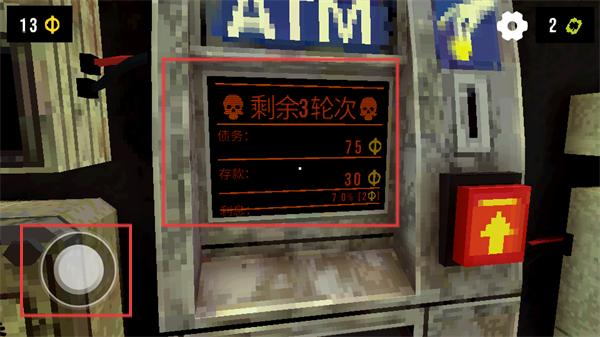 1、操控左侧轮盘移动到【ATM】机处,查看界面显示的【剩余3轮次】【债务75Φ】等信息,了解当前状态。