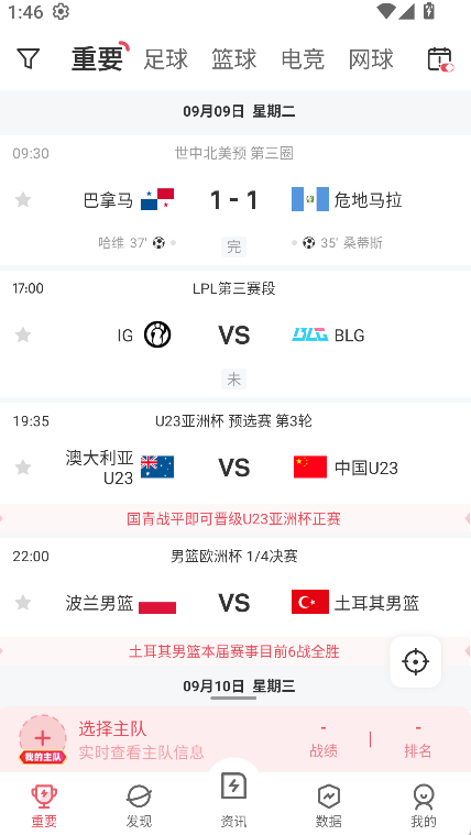 1、打开安装完成的雷速体育app后,可直接进入重要比赛页面,快速查看近期关键赛事。