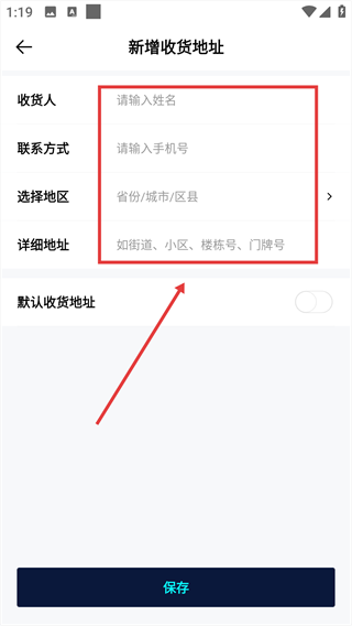 4、依次填写收货人、联系方式、地区及详细地址,完成后点击保存按钮添加地址。