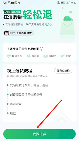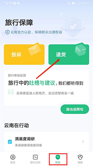1、打开 “游云南 APP”,点击底部 “保障” 选项,选择 “退货”。