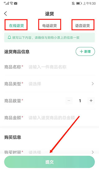 3、在退货页面,提供 “在线退货”“电话退货”“语音退货” 等方式(以 “在线退货” 为例),填写相关信息并提交。