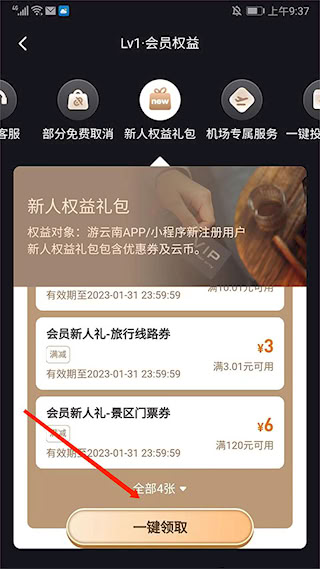 2、在用户中心页面,点击 “游云南,专属新人礼” 栏目中的 “去领取”。
