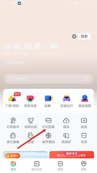 1、打开 “游云南 APP”,点击首页 “ETC 充值” 选项。