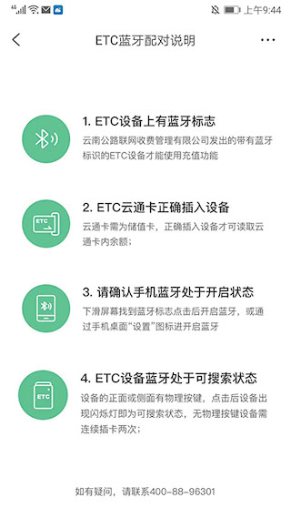 2、进入蓝牙配对页面(确保 ETC 设备有蓝牙标志,云通卡正确插入,手机及 ETC 设备蓝牙开启且可搜索),进行蓝牙配对。