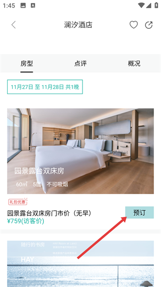3、在澜汐酒店页面,我们选【园景露台双床房】后点击【预订】按钮啦。