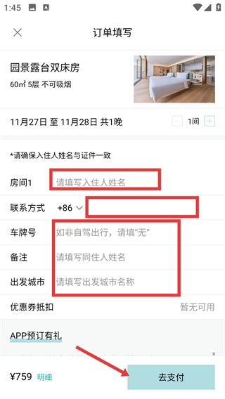 4、在订单填写页,我们填好入住信息后点击【去支付】完成订房。