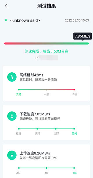 5、测速完成后,会显示本次网络测速的“测试结果”,用户可根据此结果了解当前网速。
