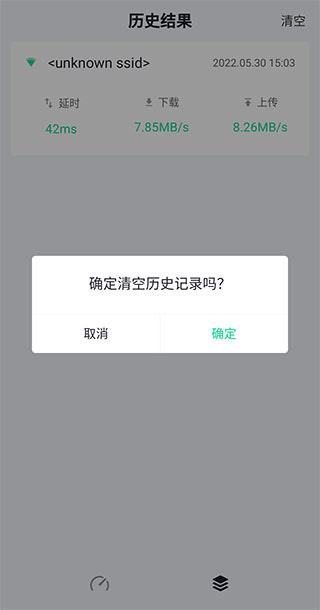 6、若想查看以往的测速记录,需切换到“历史结果”页面查看,点击右上角按钮可选择清空历史记录。