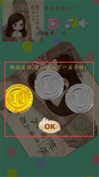 4、挑战成功后获得金币奖励,点击【OK】按钮确认,即可解锁并进入下一关卡继续挑战。