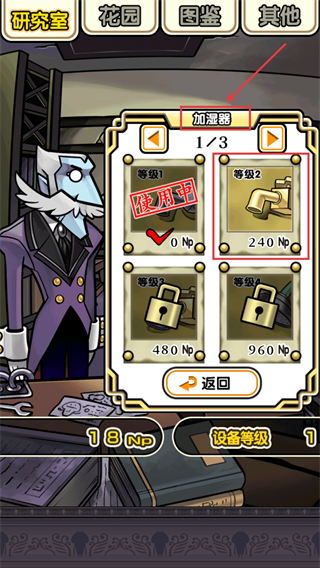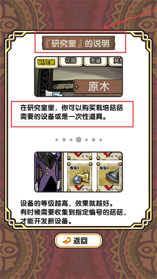 1、在研究室可购买栽培蘑菇的设备或道具,设备等级越高效果越好,还需收集指定编号蘑菇开发新设备提升栽培效率。