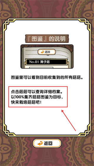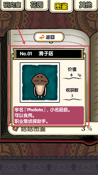 3、通过图鉴查看已收集的所有蘑菇,点击蘑菇能查询详细档案,以100%集齐蘑菇图鉴为目标来栽培更多蘑菇。
