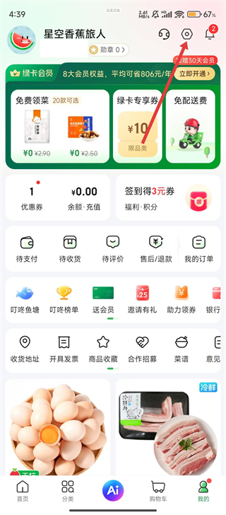 1、打开叮咚买菜,进入【我的】页面,点击右上角【设置】图标。