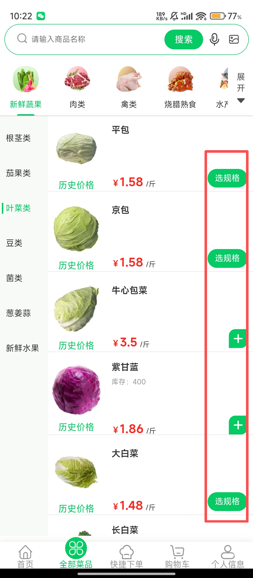 2、在蔬果页面,找到想要的菜品,点击【选规格】或加号按钮,将菜品加入购物车哦。