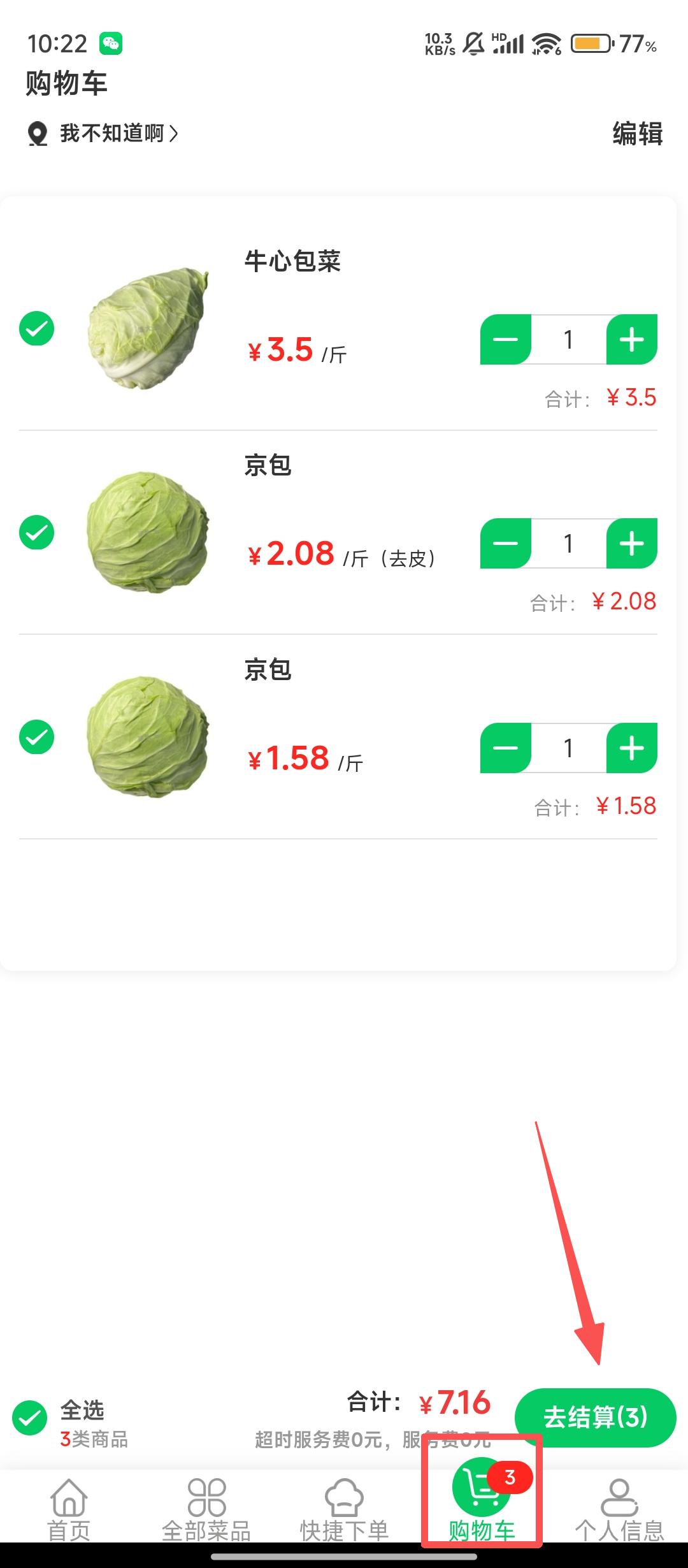 3、添加好菜品后,点击底部【购物车】,进入购物车页面,再点击【去结算】按钮呢。