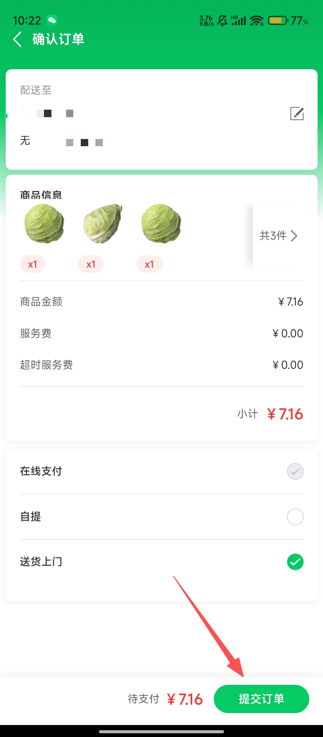 4、进入确认订单页面,选择配送方式后,点击【提交订单】,就能完成买菜下单啦。