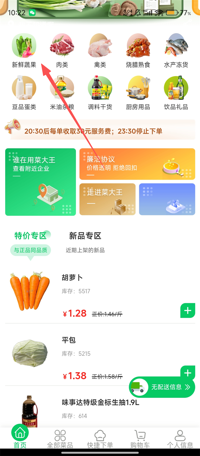 2、在菜品分类页面选心仪分类,如【新鲜蔬果】,进入对应菜品页面。