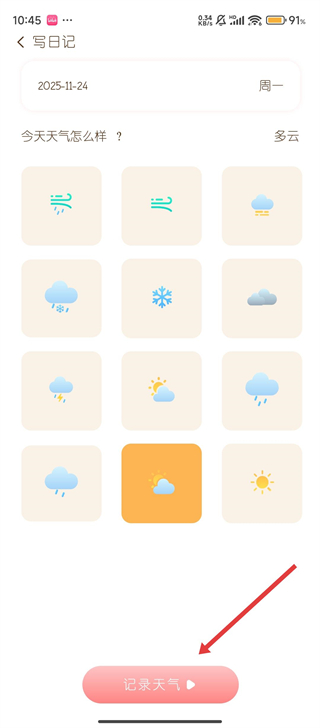 2、进入写日记界面后,选择当天对应的天气图标,再点击【记录天气】按钮,就能把天气情况保存下来哦。