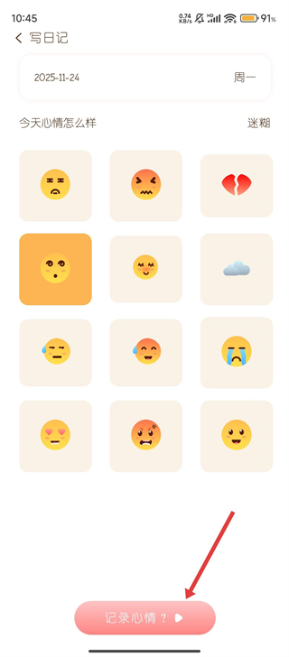 3、接着选择代表当天心情的表情图标,点击【记录心情】按钮,让情绪也有迹可循呀。