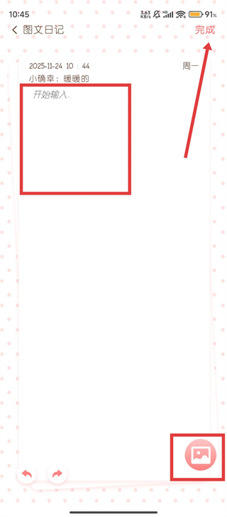 4、我们可以在输入框中写下日常点滴,还能点击图片按钮添加照片,全部完成后点击【完成】,一篇日记就记录好啦。