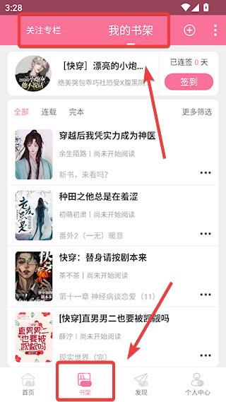 5、点击【书架】,可以查看自己的收藏和关注专栏