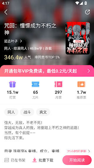 4、找到并点击喜欢的作品,可以查看作品详情并直接阅读,支持批量下载