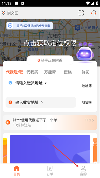 2、服务下单:在首页选择代送或代取业务类型,输入地点及联系人信息后一键提交订单等待接单。