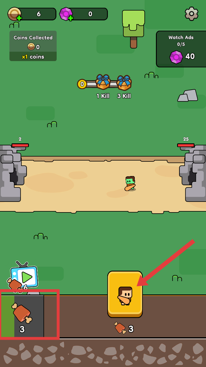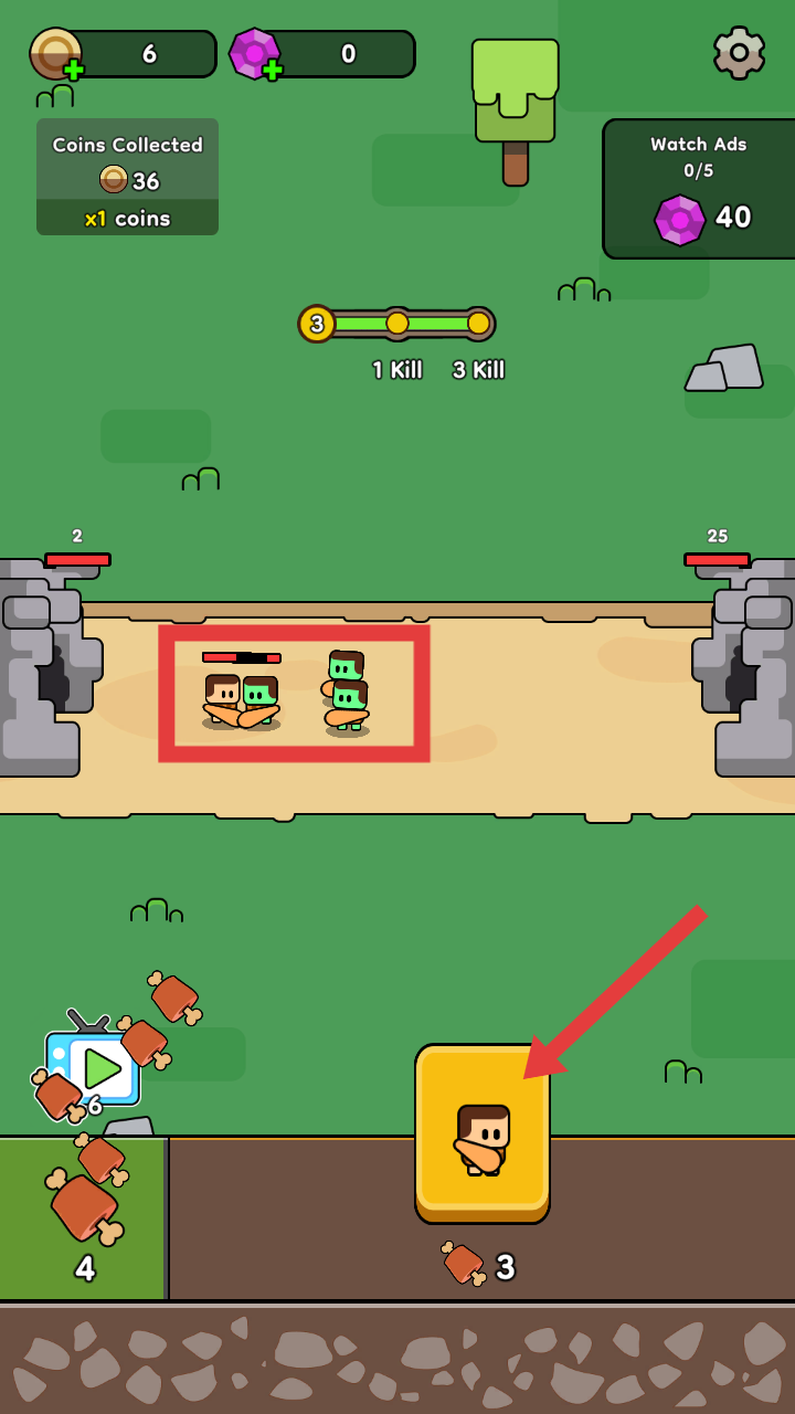 1、当左下角【肉块】积累到达3个时,点击指标位置进行召唤士兵。