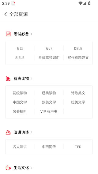 3、兴趣学习版块,提供有声读物、名人演讲、公开课和影视英语等资源,激发学习兴趣。