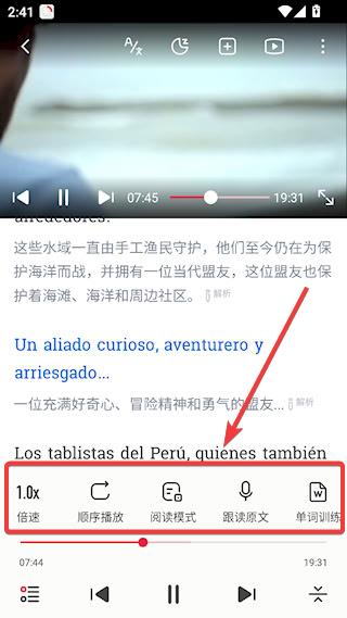 2、播放调节功能强大,提供8档语速调节、4种循环模式,支持单句精听、听写及测验,满足多样化学习需求。