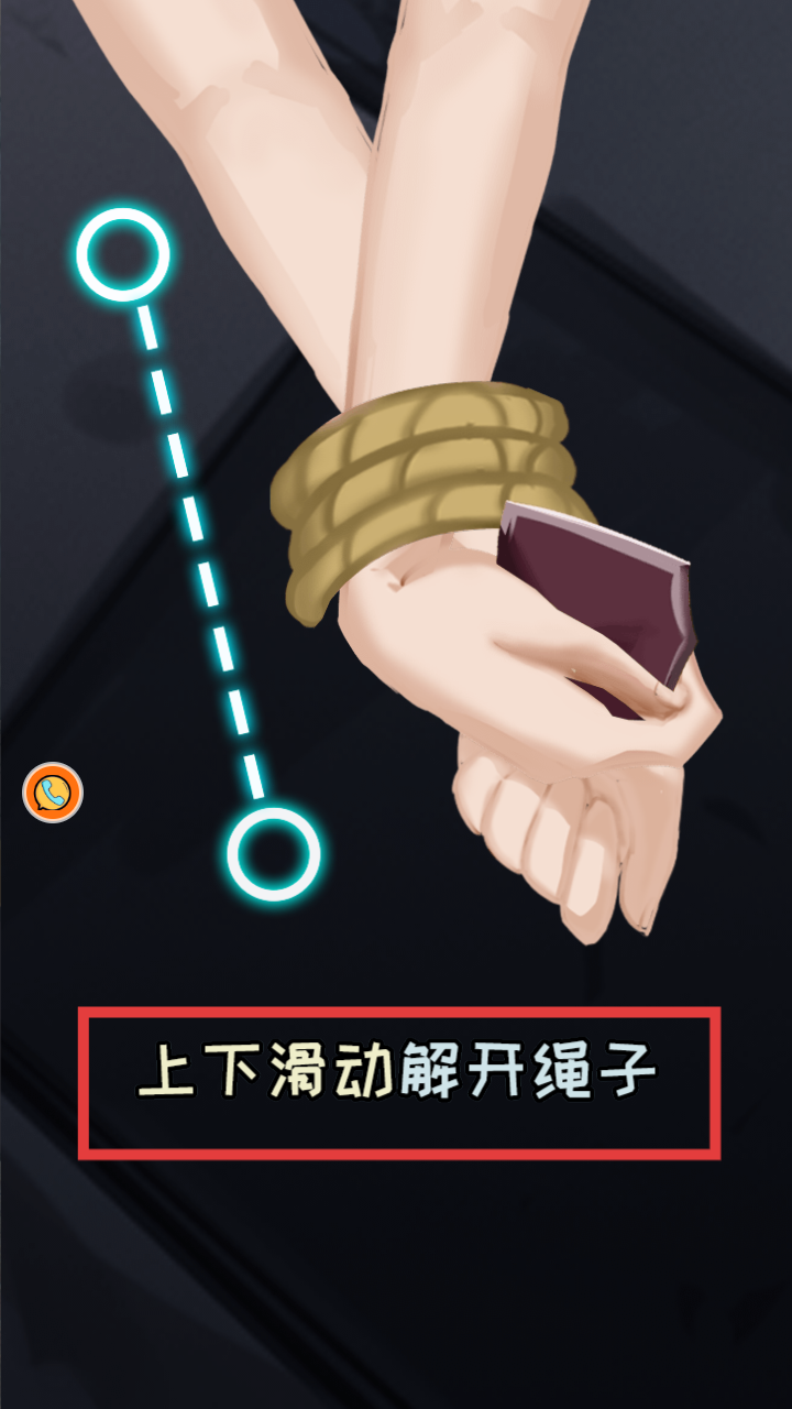 2、拿到花盆碎片后,按提示【上下滑动解开绳子】摆脱束缚。