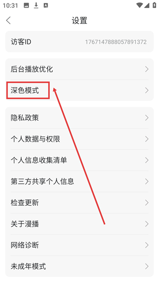 3、在设置页面中,找到【深色模式】选项,点击该选项可进入对应的模式设置页面。