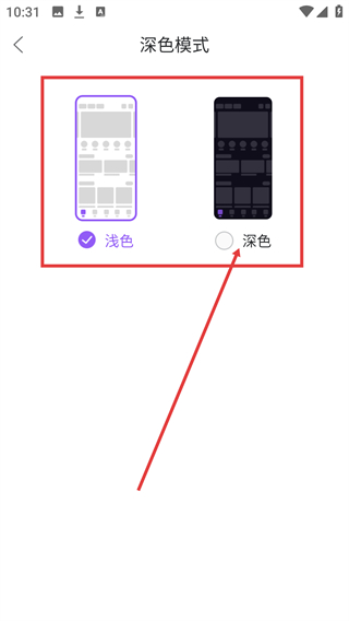 4、在深色模式页面里,选择【深色】模式,点击对应选项即可切换显示风格。