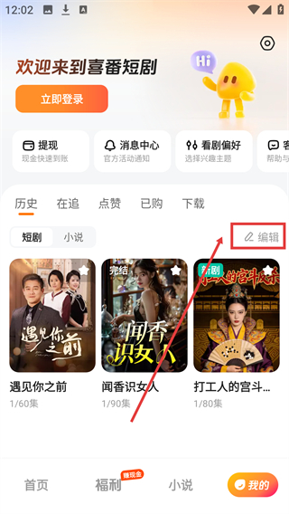2、进入【我的】页面后,在【历史】板块找到【编辑】按钮,点击即可进入剧集选择编辑界面。