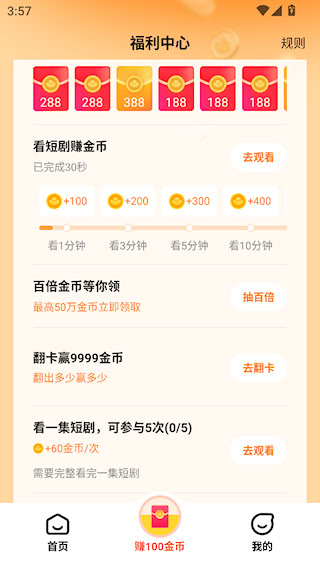 3、点击赚100金币,完成任务可获得丰富的奖励
