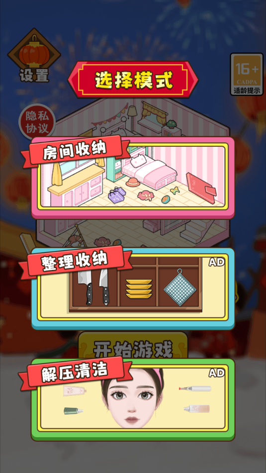 2、分为三种收纳模式,收纳房间,收纳厨具,解压清洁等。