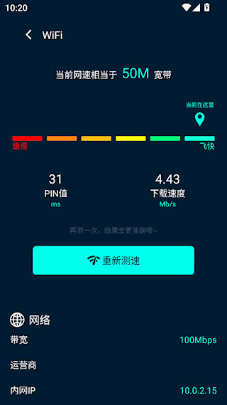 2、一键操作简洁高效,迅速获取下载、上传速度及网络延迟数据。
