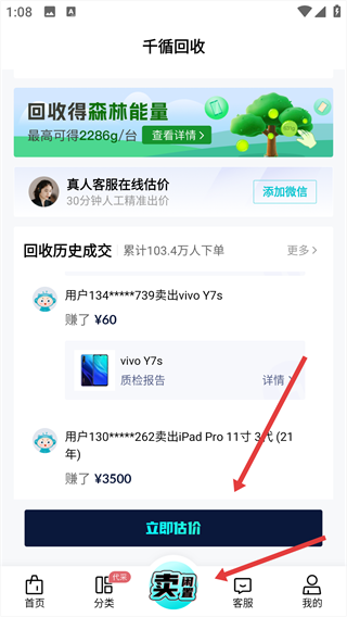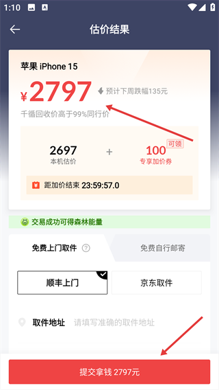 4、查看估价结果,选择取件方式,点击“提交拿钱”完成回收流程。