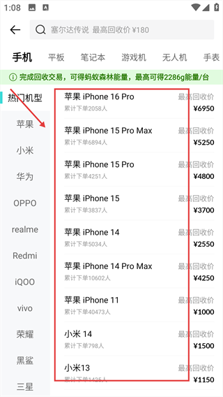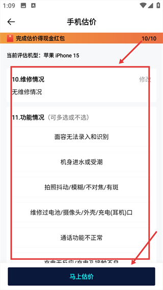 3、进入手机估价页面,填写设备的维修情况、功能情况等信息后,点击“马上估价”按钮获取回收价格。
