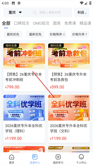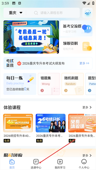 1、点击底部的【选课中心】按钮,进入课程选择页面。