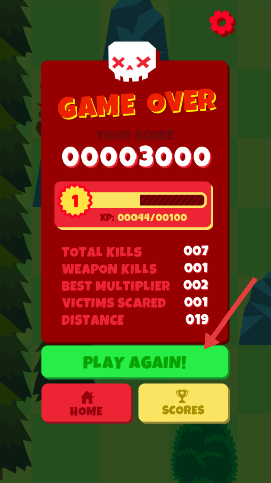 4、游戏失败点“PLAYAGAIN”,总结经验,下次多杀露营者。