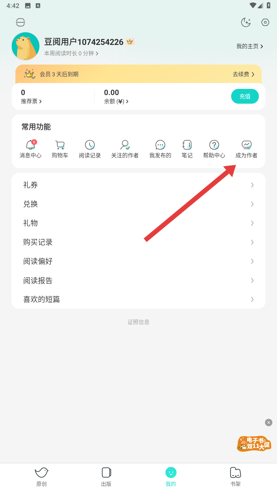 2、在【我的】页面里,找到【成为作者】选项并点击,就能进入作者申请页面啦。