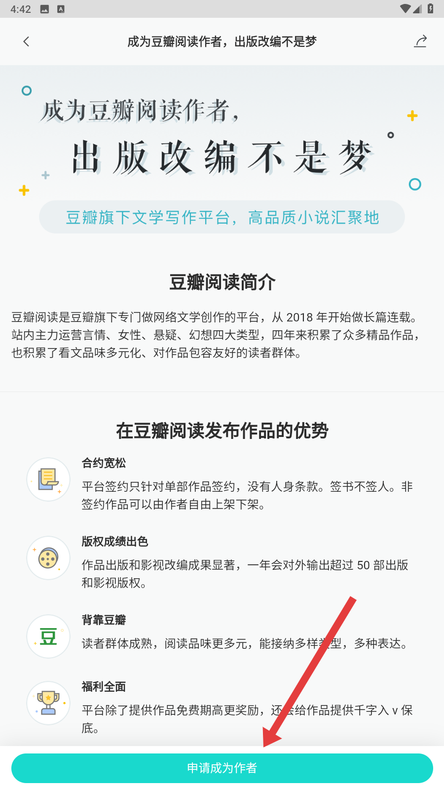 3、进入作者申请页面后,点击【申请成为作者】按钮,继续下一步操作哟。