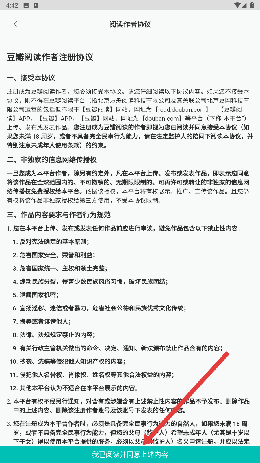 4、在阅读作者协议页面,点击【我已阅读并同意上述内容】,完成协议确认后即可进行投稿啦。